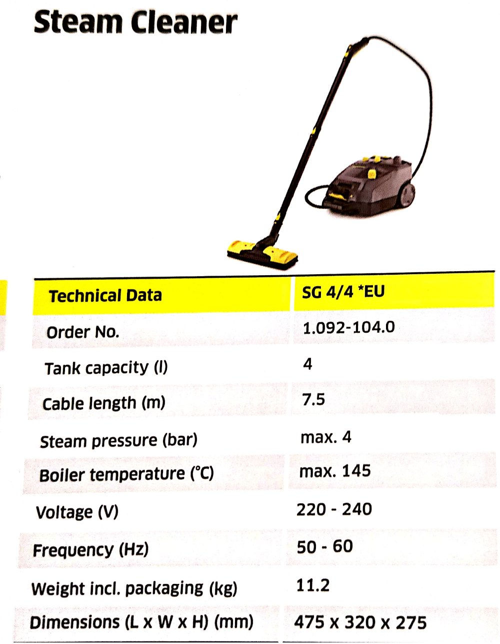 Tank Capacity (I): 4Cable Length (m): 7.5Steam Pressure (bar): Max 4Boiler Temperature (°C): Max 145Voltage (V): 220 - 240Frequency (Hz): 50 - 60Weight Including Packaging (kg): 11.2Dimensions (L x W x H)(mm): 475 x 320 x 275